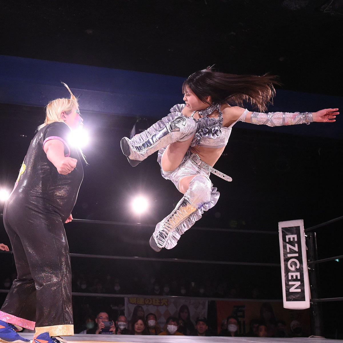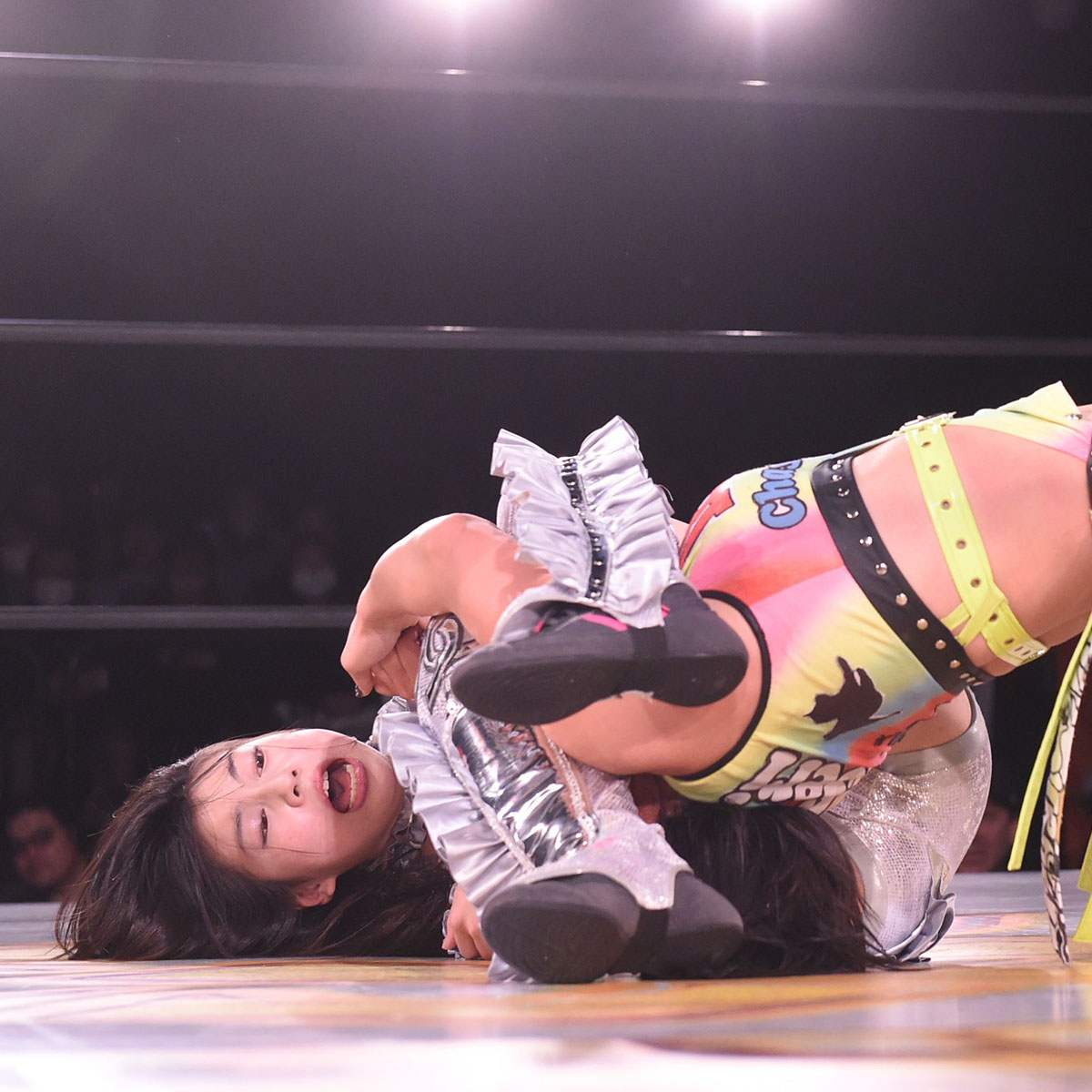 ロックアップから押し合い、クリーンブレイクからメガトンがヘッドロックに捕える。心希がこれを切り返しドロップキックの連発。しかしメガトンは倒れない。ショルダータックルから高速メガトンプレス、ゴロゴロとフォールを狙う。心希もメガトンプレスを避けると、ミドルキックの連打。メガトンのブッチャー突きを受けるも突きをお返し。さらにダブルチョップからサソリ固めを狙う。メガトンが堪え、逆にサソリ固めを狙う。