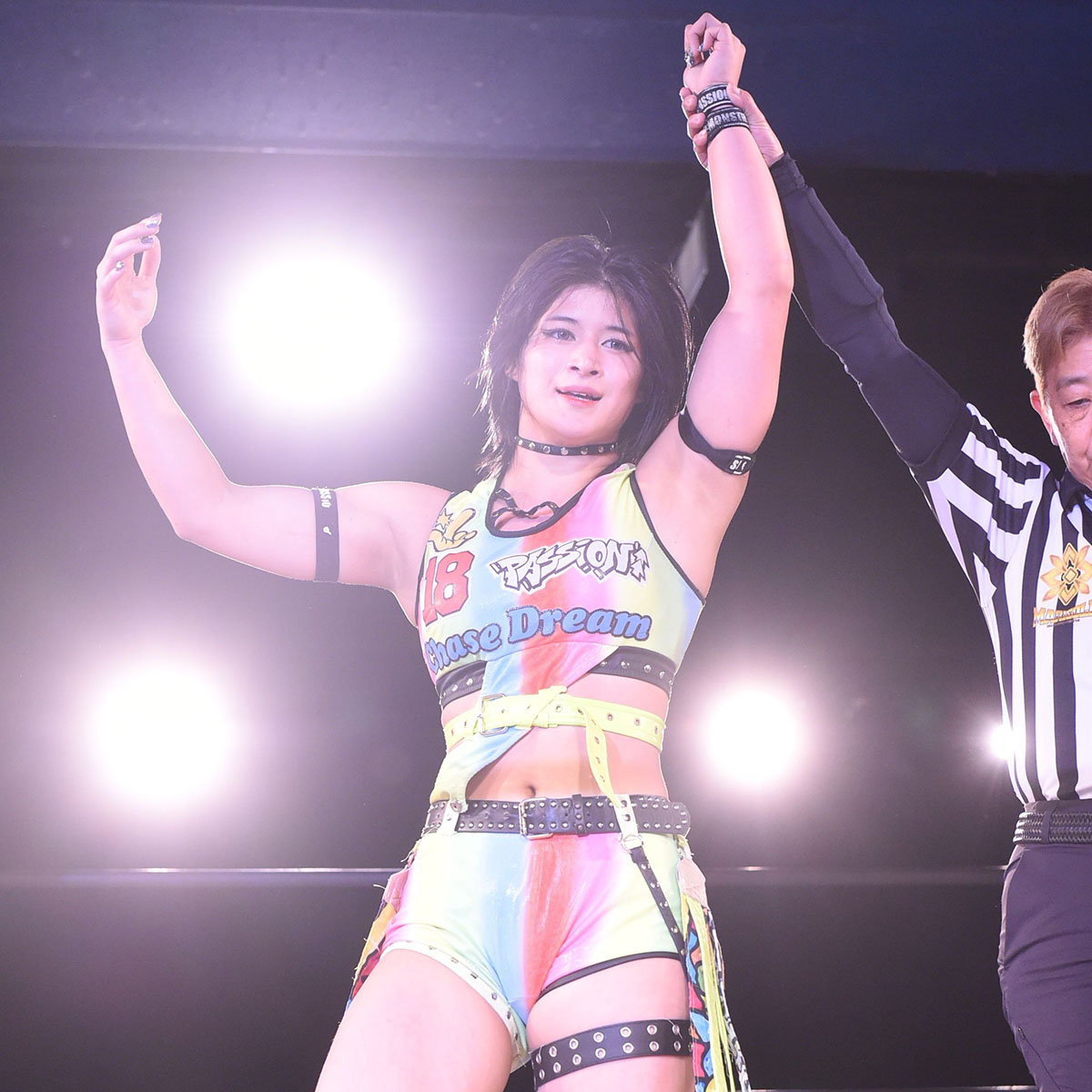 しかし、聖怜がこれをかわして張り手をいれ投げ放しジャーマン、スワンダイブ・ドロップキックからダイヤル固め。方向を変えながら回して聖怜がフォールを取った。