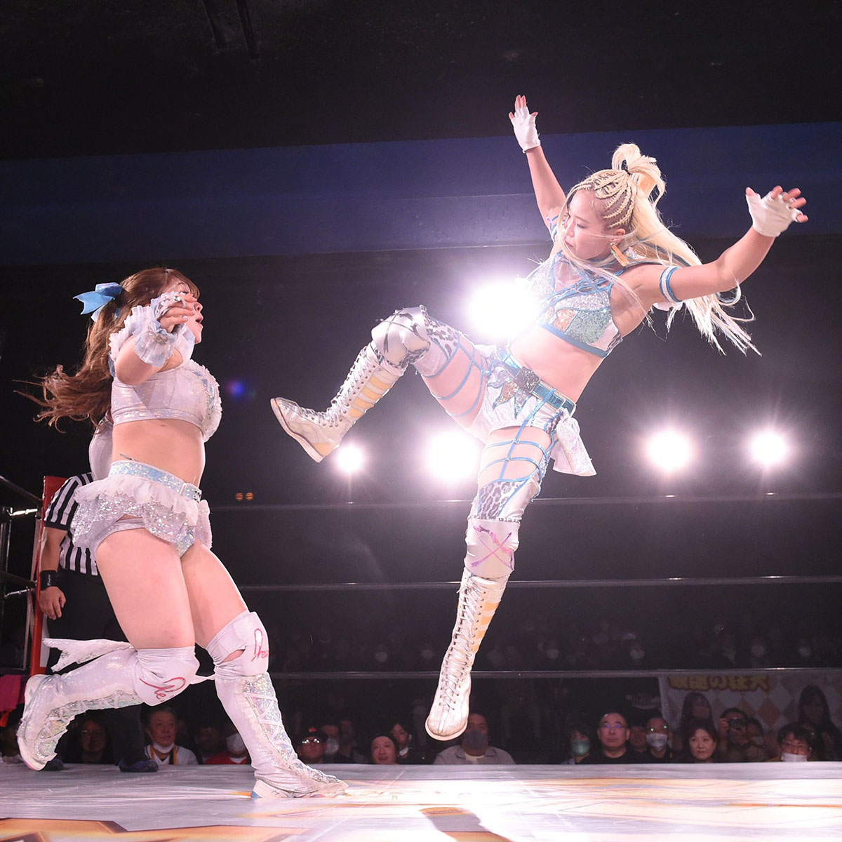 裕花が先制ドロップキックに行くと聖怜が振り払いバックを取ってグラウンドへ持ち込む。そしてリストの取り合いから再びグラウンドの攻防。聖怜がダブル・アンクルホールドを極めると裕花がロープエスケープ。エルボーの打ち合い、バックエルボーを打ち合う。そしてロープに走ると裕花がカウンターのドロップキックを決め、ヘアホイップからコーナーに詰めて逆水平チョップの連打、ボディスラム、ダブルチョップ、ドロップキック、逆エビ固めで攻め立てる。聖怜がなんとかロープエスケープ。