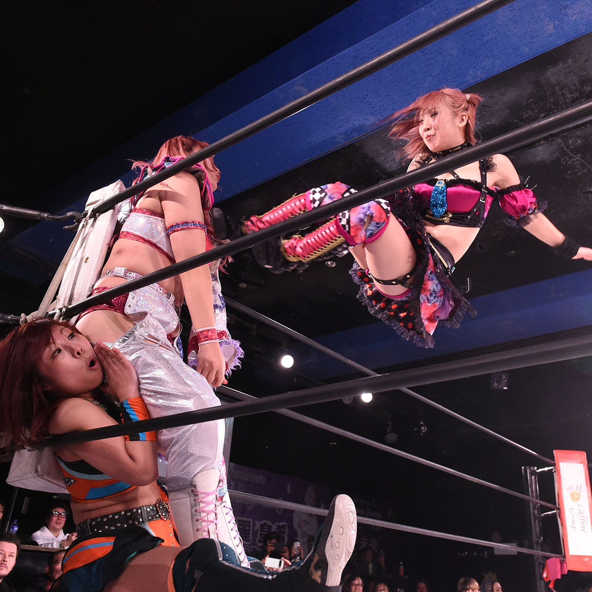 ロックアップかたリストの取り合い、ヘッドロックの取り合いからロープワーク。弓月がカウンターのドロップキッキックを決める。きずなもカウンターでワキ固めでとり、腕十字固め、アームバーを極める。ここで南小桃が入場。小桃はきずなに蹴りを入れ、弓月、きずなにエルボー攻撃。これに弓月ときずなが対抗。弓月がドロップキック、きずなが丸め込み、ダブル・ドロップキックを放つ。しかし小桃が避けて2人にドロップキック。そして小桃は串刺しドロップキックを弓月、きずなに順に入れて、2人にDDTを決める。