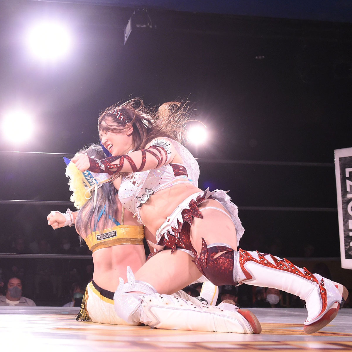 ロープに走ると、今度は聖怜がカウンターのドロップキックから双手刈り、串刺しスピアーで反撃。しかし、体落としを回転エビ固めで切り返した裕花が、フェースバスター、ドロップキックで対抗。聖怜もセカンドロープからスピアーで反撃。裕花もチンクラッカーを返す。そして両者ダウン状態になる。膝立ちでエルボーを打ち合うと、立ち上がってなおもエルボーを打ち合う。裕花がロープに走ると聖怜が捕まえ体落とし、619、ドロップキックと追い込む。ジャーマンで放り投げると裕花が着地、フットスタンプ、低空式ドロップキック、ボディシザース・ホイップ、619、低空式ドロップキックからマウントエルボーで反撃。聖怜がマウントエルボーを返しロープに走ると、裕花が延髄斬り、ブレーンバスターを決め、ダイアモンドカッターを狙う。