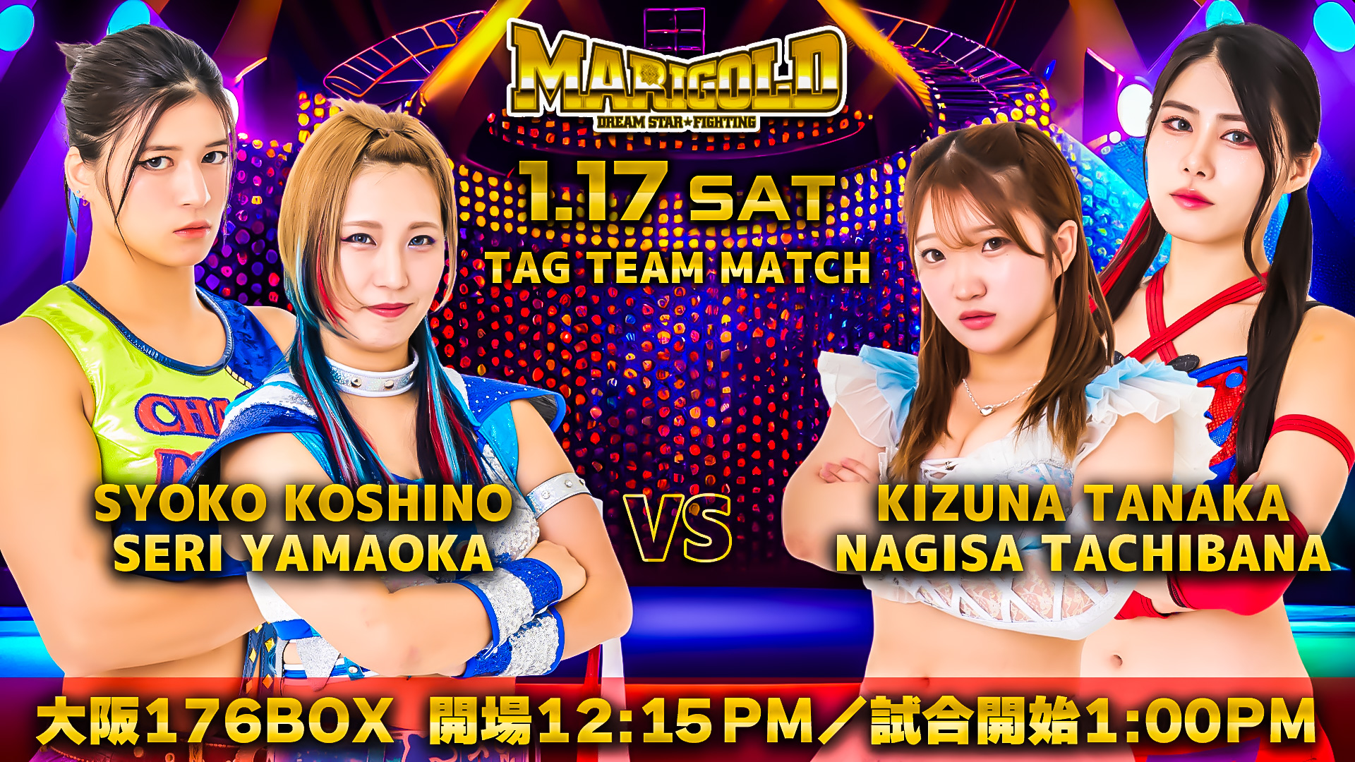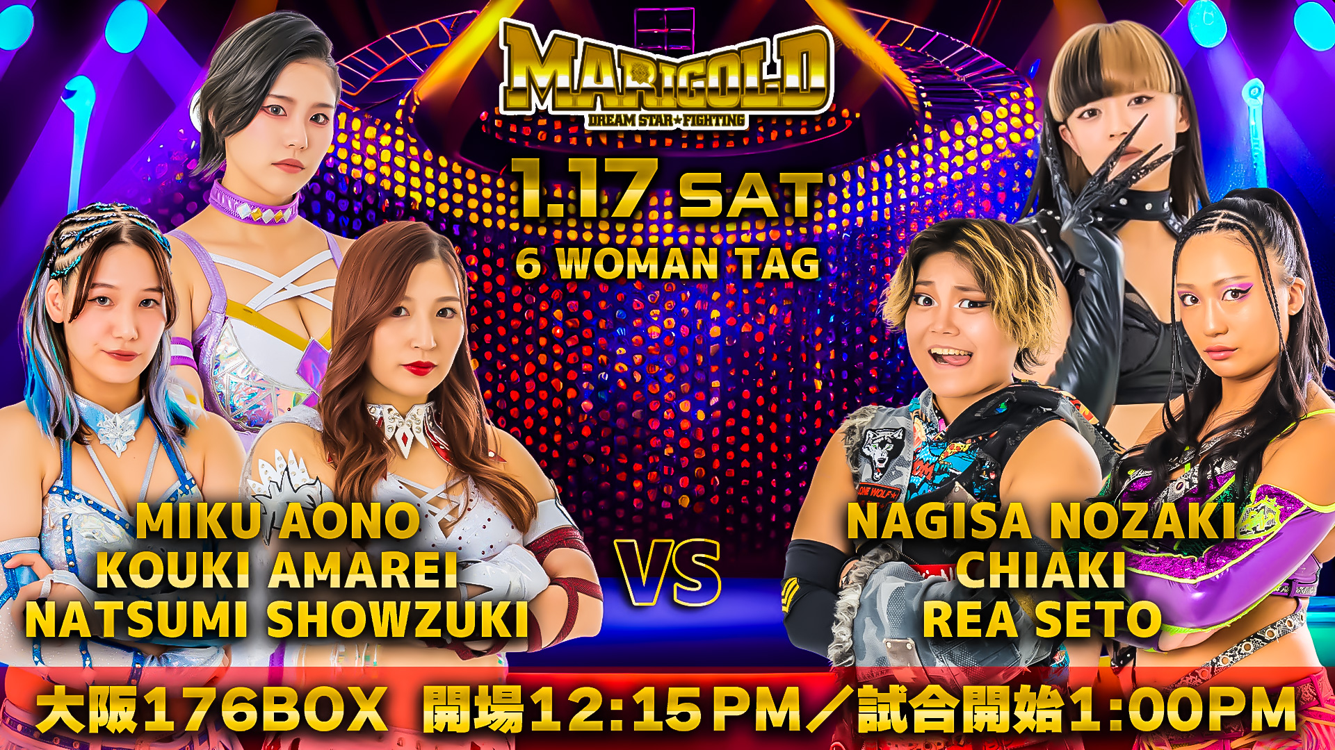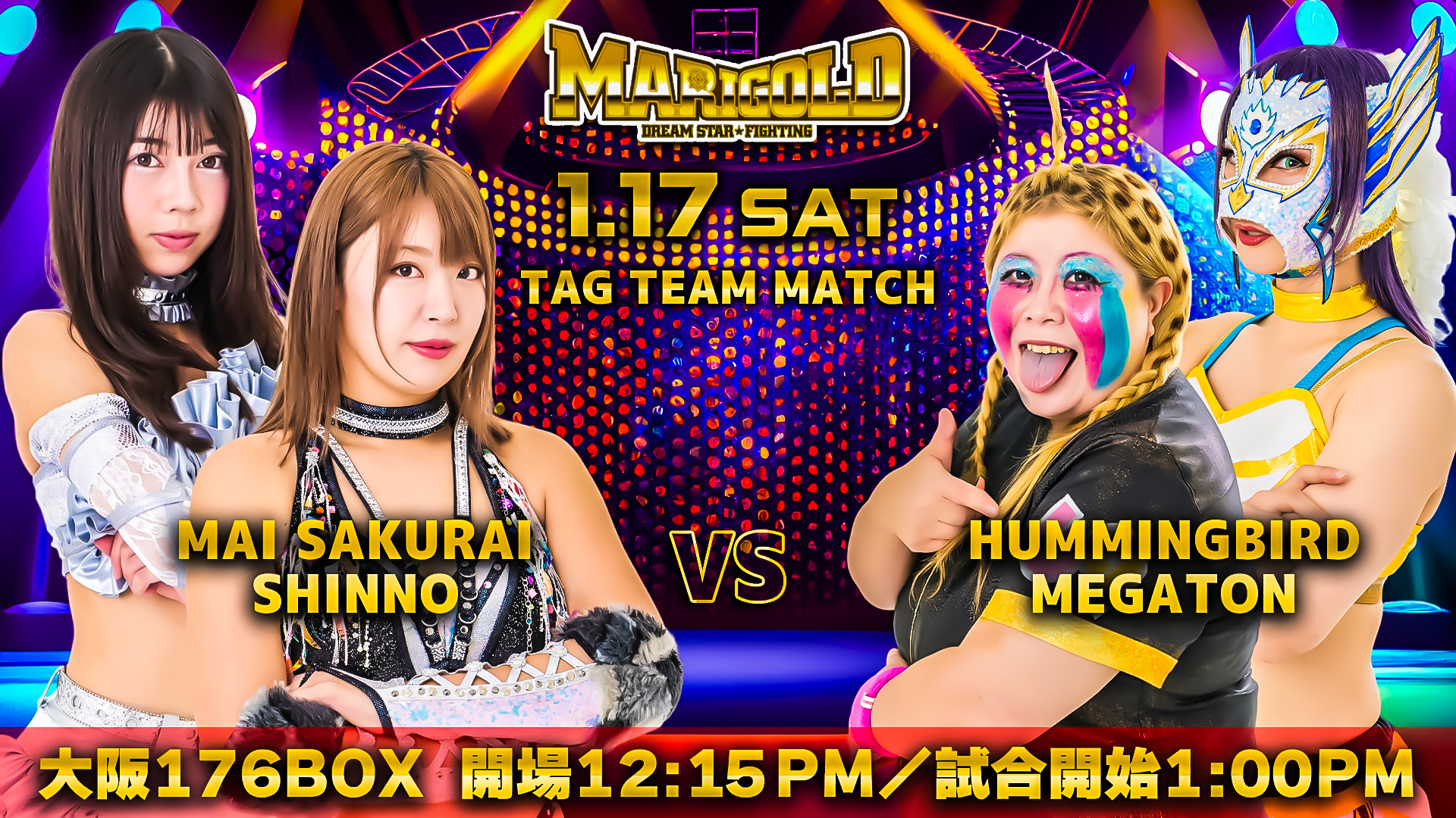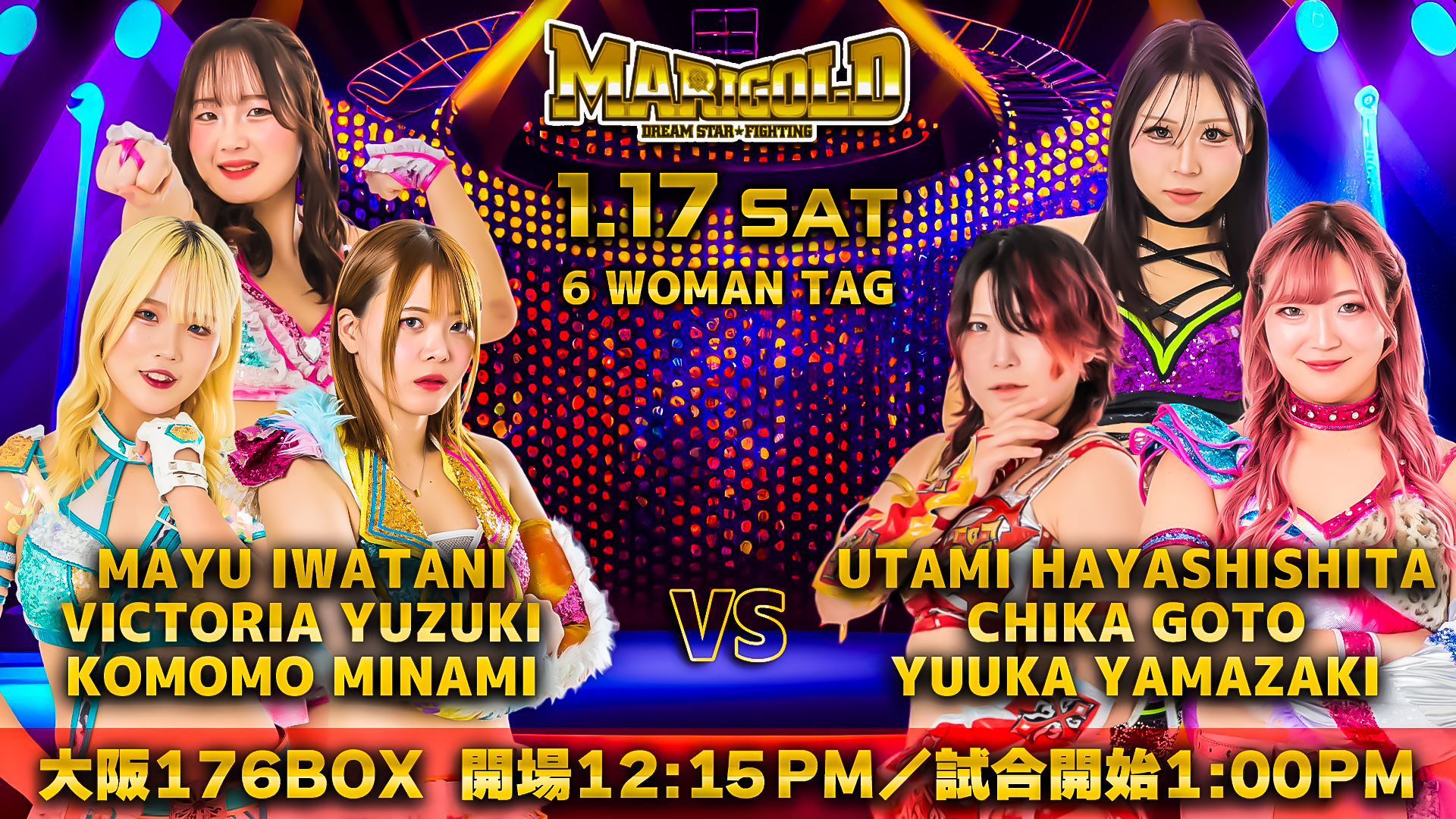 2026年1月6日2026年1月11日 New Years Golden Garden2026 2026年1月17日(土)大阪176BOX 1:00PM 〈決定カード〉 6人タッグマッチ 岩谷麻優&ビクトリア弓月&南小桃vs林下詩美&後藤智香&山﨑裕花 6人タッグマッチ 青野未来&翔月なつみ&天麗皇希vs 野崎渚&CHIAKI&瀬戸レア タッグマッチ 山岡聖怜&越野SYOKO. vs 田中きずな&橘渚 タッグマッチ 桜井麻衣&心希vs ハミングバード&メガトン シングルマッチ 石川奈青 vs 松井珠紗