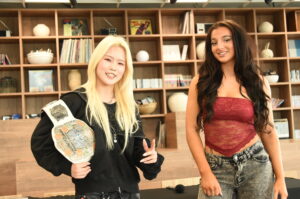 青野未来「第3代ワールドチャンピオン、青野未来です。詩美から取ったこのベルト、取ることで林下詩美を越えられると思ってたんですけど。なかなかそうでもなくて。やっぱりこのベルトを取って、より林下詩美っていう存在のデカさを自分自身、身に染みて感じていたり、自分がいつもどこか林下詩美を取った後もやっぱり意識し続けています。自分自身のチャンピオンとして、このベルトをもっと輝かせたいって思っているんですが、詩美だったらどうだったかな。やっぱり詩美がちらつく。それはやっぱりまだまだ私には足りないもの。林下詩美を越えられないんだなっていう悔しさがあります。で、もう1つ心残りというか、その越えられてないっていうのは、このベルトを取るときギリギリで、私、掟破りのBBボムで林下詩美から勝ったんですけど、屈辱的だったと思います。だけど、私にはもう何もなくて、何もなくて、それで勝てた。だけど、私は自分自身で、ほんとの意味で林下詩美から勝ちたいと思ってます。マリーゴールド3年目に入るので、ここから自分自身気を引き締めていくためにも、そしてマリーゴールドをもっともっと期待してもらうためにも、全てかけて、もちろんこのベルトを守って、林下詩美に勝つことで、この先の未来を進んでいけるかなと思ってるんで、必ずこのベルト守ります。今のマリーゴールドでできる最高の試合を林下詩美だったらできると私は思ってるんで、そんな試合を見せます」